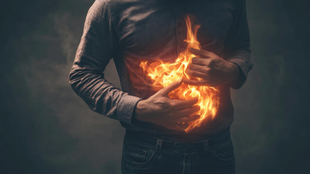 - En brännande känsla i bröstet, särskilt efter måltider eller vid böjning.